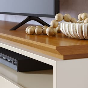O Rack Bancada Selene combina funcionalidade e estética com gavetas espaçosas, tampo suspenso e nichos abertos para organização.