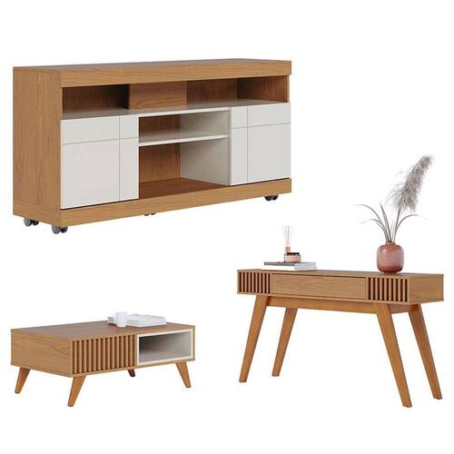Rack Bancada Yara com Mesa de Centro Jeri Freijó Off White e Aparador Riviera Freijó – Colibri