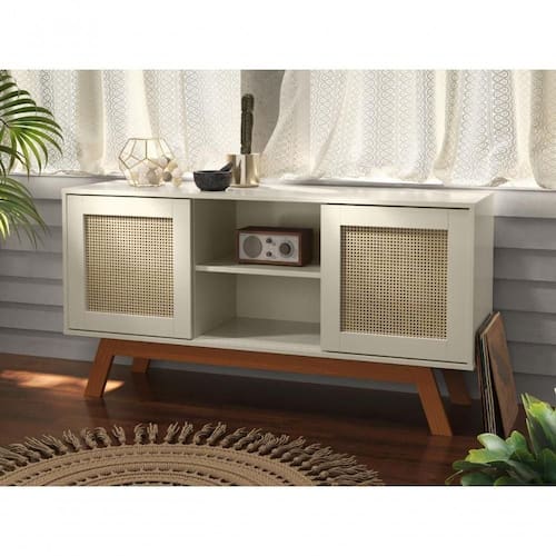 O Rack Buffet com duas portas de correr e detalhes em rattan é a solução ideal para quem busca praticidade e estilo. Seus pés em madeira conferem um toque natural, e as portas de correr facilitam o acesso ao conteúdo. Ele se encaixa bem em salas e áreas de convivência, oferecendo elegância e funcionalidade.