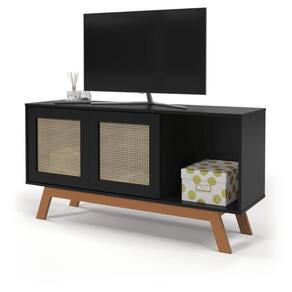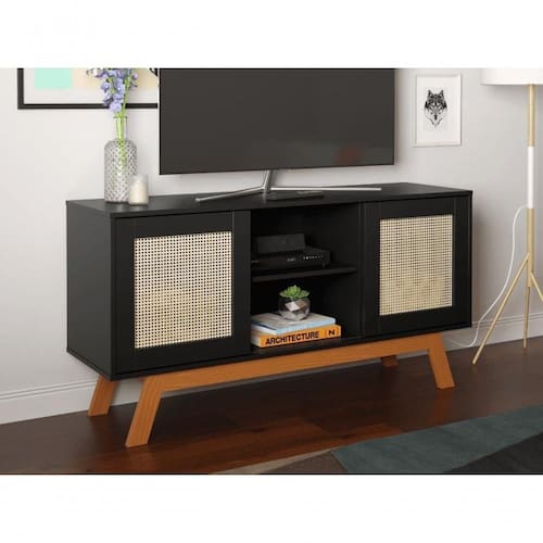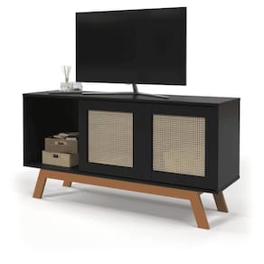 O Rack Buffet com duas portas de correr e detalhes em rattan é uma peça sofisticada que combina com qualquer estilode decoração. Com pés em madeira, ele oferece estabilidade e um design prático, ideal para organizar eletrônicos e outros itens com charme e funcionalidade.