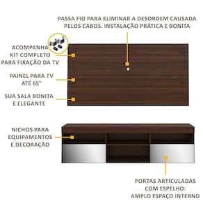 Produzido em MDP com pintura UV, que garante maior durabilidade e facilidade na limpeza, possui espaço para os equipamentos eletrônicos e nichos para objetos decorativos, além de duas portas articuladas com espelho e um amplo espaço interno para manter seus pertences organizados. Opainel P/TV de até 65possui espaçamento para passagem dos fios, que permite deixar os cabos mais organizados. Devido as variações de tamanho dos televisores no mercado, sugerimos que verifique as medidas da sua TV e compare com o painel antes de efetuar a compra.