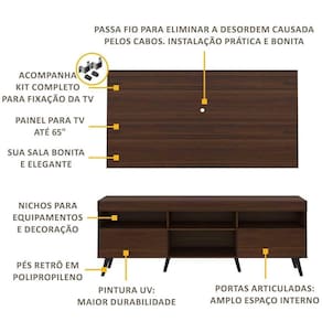 Produzido em MDP com pintura UV, que garante maior durabilidade e facilidade na limpeza, possui espaço para os equipamentos eletrônicos e nichos para objetos decorativos, além de duas portas articuladas com um amplo espaço interno para manter seus pertences organizados. Opainel P/TV de até 65possui espaçamento para passagem dos fios, que permite deixar os cabos mais organizados. Devido as variações de tamanho dos televisores no mercado, sugerimos que verifique as medidas da sua TV e compare com o painel antes de efetuar a compra.