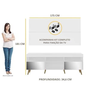 A sala de estar é o melhor lugar para receber a família e amigos, por isso ter um ambiente bonito e aconchegante é fundamental. O Rack com Painel e Suporte para TV 65" com Espelho e Pés Retrô Flórida Multimóveis é uma ótima opção para aproveitar seu espaço de maneira inteligente. Produzido em MDP com pintura UV, que garante maior durabilidade e facilidade na limpeza, possui espaço para os equipamentos eletrônicos e nichos para objetos decorativos, além de duas portas articuladas com espelho e um amplo espaço interno para manter seus pertences organizados. O painel para TV de até 65 possui espaçamento para passagem dos fios, que permite deixar os cabos mais organizados. Devido as variações de tamanho dos televisores no mercado, sugerimos que verifique as medidas da sua TV e compare com o painel antes de efetuar a compra.Para facilitar a sua vida, este produto acompanha também o kit para fixação da TV. Muito prático e de fácil instalação, pode ser utilizado para TVs LCD, LED e plasma de 14 a 71. Totalmente sobreposto, acompanha gabarito de montagem que auxilia na instalação. Conta com um sistema de encaixe rápido, possui 16mm de deslocamento que permite o ajuste do encaixe das peças. Os espelhos são de vidro (o que evita que a imagem fique distorcida) e lapidados, ou seja, passam por um processo para que as bordas não fiquem cortantes, o que garante maior segurança.Os pés palito, estilo retrô, em polipropileno, dão um charme especial ao móvel deixando-o com um visual leve e permitindo você compor um ambiente com ar vintage e moderno ao mesmo tempo.No mercado moveleiro desde 1995, a Multimóveis utiliza tecnologia de ponta e se diferencia através do acabamento superior, demonstrando o cuidado e carinho na fabricação dos móveis. Utilizamos matéria-prima de madeira proveniente de reflorestamento, que contribui para a preservação do meio ambiente.Tamanho Painel TV: 175 x 90cmDevido as variações de tamanho dos televisores no mercado, sugerimos que verifique as medidas da sua TV e compare com o painel antes de efetuar a compra.Dimensões do produto montado:Painel - Altura: 90cm | Largura: 175cm | Profundidade: 2,5cmRack - Altura: 63,6cm | Largura: 175cm | Profundidade: 34,6cmDisponível em 9 opções de cores: Branco Branco/Preto Branco/Natural Preto Preto/Branco Preto/Natural Duna/Branco Duna/Preto Duna/Natural.As cores do produto podem sofrer variações de tonalidade de acordo com as configurações do seu monitor/celular.Imagem meramente ilustrativa. Decoração não acompanha o produto.Produto NOVO acompanha nota fiscal, manual de montagem e certificado de garantia.O produto será entregue desmontado e a Multimóveis não disponibiliza o serviço de montagem.