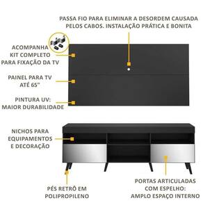 A sala de estar é o melhor lugar para receber a família e amigos, por isso ter um ambiente bonito e aconchegante é fundamental. O Rack com Painel e Suporte para TV 65" com Espelho e Pés Retrô Flórida Multimóveis é uma ótima opção para aproveitar seu espaço de maneira inteligente. Produzido em MDP com pintura UV, que garante maior durabilidade e facilidade na limpeza, possui espaço para os equipamentos eletrônicos e nichos para objetos decorativos, além de duas portas articuladas com espelho e um amplo espaço interno para manter seus pertences organizados. O painel para TV de até 65 possui espaçamento para passagem dos fios, que permite deixar os cabos mais organizados. Devido as variações de tamanho dos televisores no mercado, sugerimos que verifique as medidas da sua TV e compare com o painel antes de efetuar a compra.Para facilitar a sua vida, este produto acompanha também o kit para fixação da TV. Muito prático e de fácil instalação, pode ser utilizado para TVs LCD, LED e plasma de 14 a 71. Totalmente sobreposto, acompanha gabarito de montagem que auxilia na instalação. Conta com um sistema de encaixe rápido, possui 16mm de deslocamento que permite o ajuste do encaixe das peças. Os espelhos são de vidro (o que evita que a imagem fique distorcida) e lapidados, ou seja, passam por um processo para que as bordas não fiquem cortantes, o que garante maior segurança.Os pés palito, estilo retrô, em polipropileno, dão um charme especial ao móvel deixando-o com um visual leve e permitindo você compor um ambiente com ar vintage e moderno ao mesmo tempo.No mercado moveleiro desde 1995, a Multimóveis utiliza tecnologia de ponta e se diferencia através do acabamento superior, demonstrando o cuidado e carinho na fabricação dos móveis. Utilizamos matéria-prima de madeira proveniente de reflorestamento, que contribui para a preservação do meio ambiente.Tamanho Painel TV: 175 x 90cmDevido as variações de tamanho dos televisores no mercado, sugerimos que verifique as medidas da sua TV e compare com o painel antes de efetuar a compra.Dimensões do produto montado:Painel - Altura: 90cm | Largura: 175cm | Profundidade: 2,5cmRack - Altura: 63,6cm | Largura: 175cm | Profundidade: 34,6cmDisponível em 9 opções de cores: Branco Branco/Preto Branco/Natural Preto Preto/Branco Preto/Natural Duna/Branco Duna/Preto Duna/Natural.As cores do produto podem sofrer variações de tonalidade de acordo com as configurações do seu monitor/celular.Imagem meramente ilustrativa. Decoração não acompanha o produto.Produto NOVO acompanha nota fiscal, manual de montagem e certificado de garantia.O produto será entregue desmontado e a Multimóveis não disponibiliza o serviço de montagem.