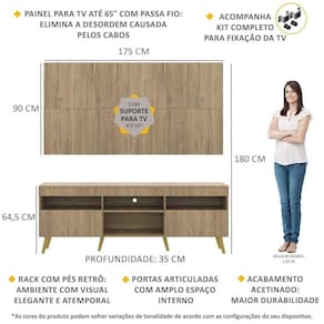 O Rack com Painel e Suporte para TV até 65 Polegadas com 2 portas e Pés Retrô Londres Multimóveis é produzido em MDP com acabamento acetinado, que garante maior durabilidade e facilidade na limpeza. Possui 4 nichos com espaço para os equipamentos eletrônicos, 2 portas articuladas com um amplo espaço interno para manter seus pertences organizados e pés palito, estilo retrô, em polipropileno, que dão um charme especial ao móvel deixando-o com um visual leve e permitindo você compor um ambiente com ar vintage e moderno ao mesmo tempo. O painel para TV de até 65 possui espaçamento para passagem dos fios, que permite deixar os cabos mais organizados e o visual clean. Para facilitar a sua vida, este produto acompanha também o kit para fixação da TV. Muito prático e de fácil instalação, pode ser utilizado para TVs LCD, LED e plasma de 14 a 71. Totalmente sobreposto, acompanha gabarito de montagem que auxilia na instalação. Conta com um sistema de encaixe rápido, possui 16mm de deslocamento que permite o ajuste do encaixe das peças. Uma ótima opção para deixar sua sala linda e confortável para curtir os melhores filmes e séries.
