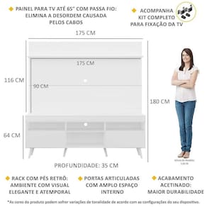 Dimensões do produto montado: Altura: 180cm | Largura: 175cm | Profundidade: 35cm *Devido as variações de tamanho dos televisores no mercado, sugerimos que verifique as medidas da sua TV e compare com o painel antes de efetuar a compra. *Você pode consultar as medidas internas na imagem técnica do produto.
