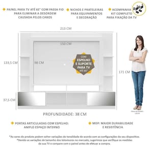 O Rack com Painel e Suporte TV 65" Portas com Espelho Oslo Multimóveis é perfeito para você deixar seu ambiente organizado e muito bem decorado. Produzido em MDP, que garante maior durabilidade e facilidade na limpeza, além de um acabamento superior, possui 2 portas articuladas com um excelente espaço interno para organizar seus pertences, prateleiras para que você possa personalizar a decoração e nichos para acomodar todos os equipamentos eletrônicos. Os detalhes com espelhos nas portas deixam o móvel mais requintado, criando um ambiente moderno e charmoso. Os espelhos são de vidro (o que evita que a imagem fique distorcida) e lapidados, ou seja, passam por um processo para que as bordas não fiquem cortantes, o que garante maior segurança. O painel com suporte para TV de até 65 (suporta até 30kg) possui espaçamento para passagem dos fios, que permite deixar os cabos mais organizados. Para facilitar a sua vida, este produto acompanha também o kit para fixação da TV. Muito prático e de fácil instalação, pode ser utilizado para TVs LCD, LED e plasma de 14 a 71. Totalmente sobreposto, acompanha gabarito de montagem que auxilia na instalação. Conta com um sistema de encaixe rápido, possui 16mm de deslocamento que permite o ajuste do encaixe das peças.