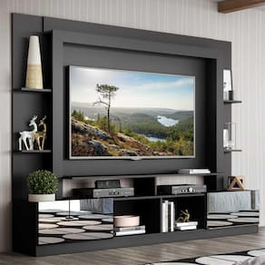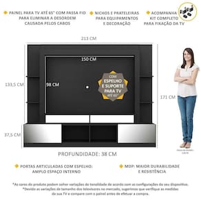 Dimensões do produto montado: Altura: 171cm | Largura: 213cm | Profundidade: 38cm Painel - Altura: 98cm | Largura: 150cm *Devido as variações de tamanho dos televisores no mercado, sugerimos que verifique as medidas da sua TV e compare com o painel antes de efetuar a compra. *Você pode consultar as medidas internas na imagem técnica do produto.
