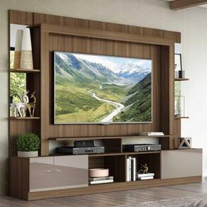 Rack c/ Painel e Suporte TV 65" Prateleiras c/ Espelho Oslo Multimóveis Madeirado/Lacca Fumê - Marrom
