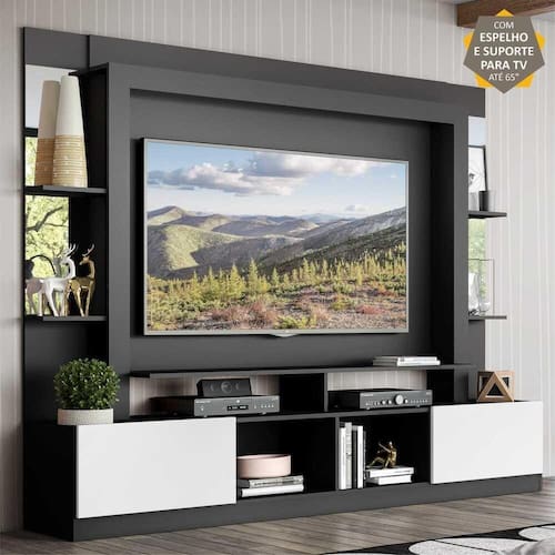 Rack c/ Painel e Suporte TV 65" Prateleiras c/ Espelho Oslo Multimóveis Preto/Branco - Preto