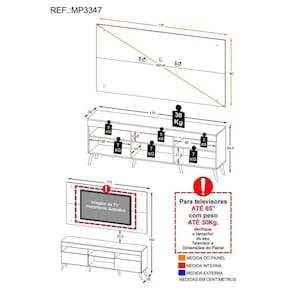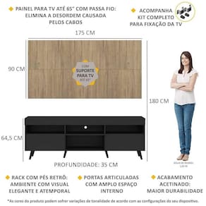 Dimensões do produto montado: Painel - Altura: 90cm | Largura: 175cm | Profundidade: 2,5cm Rack - Altura: 64,5cm | Largura: 175cm | Profundidade: 35cm *Devido as variações de tamanho dos televisores no mercado, sugerimos que verifique as medidas da sua TV e compare com o painel antes de efetuar a compra. *Você pode consultar as medidas internas na imagem técnica do produto.