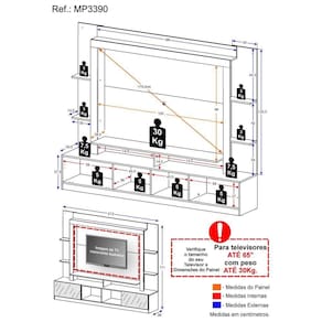 Dimensões do produto montado: Altura: 171cm | Largura: 213cm | Profundidade: 38cm Painel - Altura: 98cm | Largura: 150cm *Devido as variações de tamanho dos televisores no mercado, sugerimos que verifique as medidas da sua TV e compare com o painel antes de efetuar a compra. *Você pode consultar as medidas internas na imagem técnica do produto.