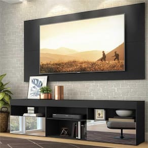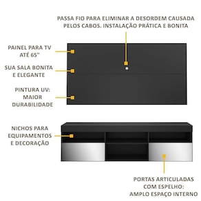 Produzido em MDP com pintura UV, que garante maior durabilidade e facilidade na limpeza, possui espaço para os equipamentos eletrônicos e nichos para objetos decorativos, além de duas portas articuladas com espelho e um amplo espaço interno para manter seus pertences organizados. O painel para TV de até 65 possui espaçamento para passagem dos fios, que permite deixar os cabos mais organizados. Devido as variações de tamanho dos televisores no mercado, sugerimos que verifique as medidas da sua TV e compare com o painel antes de efetuar a compra. Os espelhos são de vidro (o que evita que a imagem fique distorcida) e lapidados, ou seja, passam por um processo para que as bordas não fiquem cortantes, o que garante maior segurança.