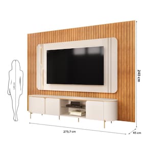você escolha a TV ideal para usar com este móvel. Ainda sobre o painel da TV. Acabamento: Pintura UV Acabamento da Porta: Pintura UV Acabamento da Prateleira: Vidro Acabamento dos Pés: Pintura Acompanha Lâmpada: 02 Altura do Painel: 240 cm Altura do Rack: 57 cm Altura dos Pés: 5 cm Ambiente Principal: Sala de Estar Complexidade da Montagem: Alta: deve ser montado por um montador especializado Cor: Off White/Freijó Cor do Produto: Off White/Freijó Escala de Brilho: Semi-Brilho Escala de Brilho da Porta: Semi-Brilho Escala de Brilho da Prateleira: Não Possui Espessura do Painel: 19 cm Espessura do Vidro: 6 mm Ideal para TVs até (Polegadas): 75 Itens Inclusos: 1 Rack + 1 Painel + Manual de Montagem Largura do Painel: 275,7 cm Largura do Rack: 241 cm Manual de Montagem e Instalação: https://cdn2.madeiramadeira.com.br/atributo/dj-moveis/2651272-5316-17380704810991.pdf Marca: Dj Móveis Material da Porta: MDF Material da Prateleira: Vidro Material do Puxador da Porta: MDF Material dos Pés: Metal Material Principal: MDF/MDP Necessita Montagem: Sim Peso do Painel: 90,05 kg Peso do Rack: 52,7 kg Peso Máximo por Prateleira: 2 kg Possui Espelho: Não Possui iluminação: Sim Possui Pés: 05 Possui Portas: Sim Possui Prateleiras: Sim Possui Tomada: Não Possui Vidro: Sim Profundidade do Rack: 45 cm Quantidade de Nichos: 04 Recomendações de Uso, Manutenção e Limpeza: Para manter seu móvel novo por muito mais tempo, evite locais úmidos, mantenha-o distante de líquidos e de fontes de calor. Evite aexposição prolongada ao sol. Para limpá-lo com segurança utilize uma flanela seca sem produtos abrasivos e nem lustra móvei Sapatas Niveladoras: Sim Sistema de Montagem: Minifix, cavilhas e parafusos Suporte de TV Universal Incluso: Não Tipo de Dobradiça/Corrediça da Porta: Metálica Tipo de Puxador da Porta: Embutido