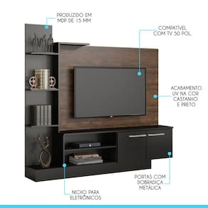 Características: Produzido em MDP de 15 mm Acabamento UV na cor Castanho e Preto 02 Portas com Dobradiça Metálica Puxadores Alça em ABS Cromado com TV até 50 Polegadas