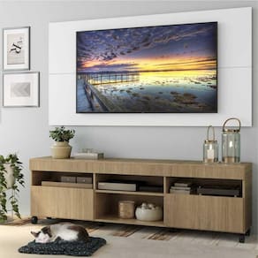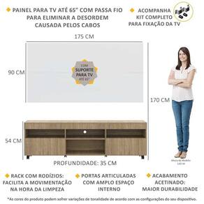 O Rack com Painel e Suporte para TV até 65 Polegadas com 2 portas e Rodízios Londres Multimóveis é produzido em MDP com acabamento acetinado, que garante maior durabilidade, possui rodízios que facilitam a movimentação na hora da limpeza, 4 nichos com espaço para os equipamentos eletrônicos e objetos decorativos, além de 2 portas articuladas com um amplo espaço interno para manter seus pertences organizados. O painel para TV de até 65 possui espaçamento para passagem dos fios, que permite deixar os cabos mais organizados e o visual clean. Para facilitar a sua vida, este produto acompanha também o kit para fixação da TV. Muito prático e de fácil instalação, pode ser utilizado para TVs LCD, LED e plasma de 14 a 71. Totalmente sobreposto, acompanha gabarito de montagem que auxilia na instalação. Conta com um sistema de encaixe rápido, possui 16mm de deslocamento que permite o ajuste do encaixe das peças. Uma ótima opção para deixar sua sala linda e confortável para curtir os melhores filmes e séries.