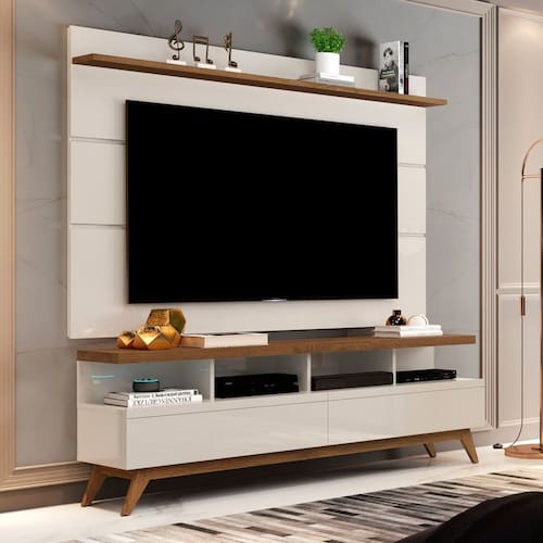 Rack com Painel Vivare Wood 1.6 para TV até 60 polegadas, 2 gavetões com corrediças telescópicas que facilitam abertura deixando mais leves, pés em madeira maciça e prateleira no painel. Espaços generosos para sua decoração e equipamentos. É um conjunto que vai deixar a sua sala mais aconchegante e sofisticada. Produto Montado: Sim Acabamento: Impressão Acabamento da Gaveta: Impressão Acabamento da Prateleira: Impressão Altura do Painel: 132 cm Altura do Rack: 62 cm Altura dos Pés: 15 cm Altura Máxima dos Pés: 15.0000 Ambiente Principal: Sala de Estar codigo_ean: 7900288128850 Complexidade da Montagem: Alta: deve ser montado por um montador especializado Cor: Off White/Freijó Cor do Produto: Off White/Freijó Escala de Brilho: Semi-Brilho Escala de Brilho da Prateleira: Semi-Brilho Espessura do Painel: 21 cm Espessura do Tampo: 20 mm Fixação na Parede: Sim Gaveta com Chave: Não Ideal para TVs até (Polegadas): 60 Itens Inclusos: 1 Rack, 1 Painel e Manual de Montagem Largura do Painel: 160 cm Largura do Rack: 160 cm Manual de Montagem e Instalação: https://product-hub-prd.madeiramadeira.com.br/934106425/documents/72ff615e-cebf-4664-89aa-f1f32df807042866023391717452837030302.pdf Marca: Giga Móveis Material da Gaveta: MDF/MDP Material da Prateleira: MDF/MDP Material dos Pés: Madeira Maciça Material Principal: MDF/MDP Necessita Montagem: Sim Peso do Painel: 29 kg Peso do Rack: 42 kg Peso Máximo por Gaveta: 5 kg Peso Máximo por Prateleira: 5 kg Possui Espelho: Não Possui iluminação: Não Possui Passa Cabos: Sim Possui Pés: 04 Possui Portas: Não Possui Tomada: Não Possui Vidro: Não Profundidade do Painel: 21.0000 Profundidade do Rack: 40 cm Recomendações de Uso, Manutenção e Limpeza: Limpe Com Pano Levemente Umedecido Em Água. Nunca Utilize Produto Químico. Sapatas Niveladoras: Não Sistema de Montagem: parafusos, girofix e cavilhas Suporte de TV Universal Incluso: Não Tipo de Corrediça da Gaveta: Metálica Telescópica Tipo de Madeira Maciça dos Pés: Eucalipto Tipo de Puxador da Gaveta: Embutido Marca: Giga Móveis