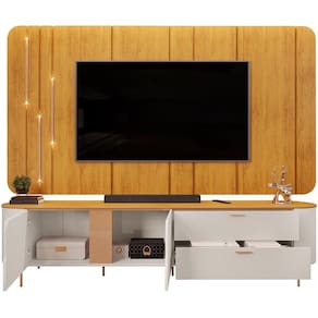 Os contornos suaves e os cantos arredondados do painel e rack não apenas conferem um visual harmônico, mas também garantem que a estética orgânica se destaque em qualquer decoração, trazendo um ar de tranquilidade e beleza natural para sua sala. Já os pés metálicos na cor dourada proporcionam um contraste perfeito, adicionando um elemento de robustez e confere estabilidade ao móvel, ao passo que a tonalidade dourada traz um toque de glamour, que combina com qualquer paleta de cores. Para completar essa experiência visual, o painel para conta com iluminação LED que valoriza ainda mais a sua , criando uma atmosfera acolhedora, ideal para momentos de lazer e entretenimento com a família e amigos.
