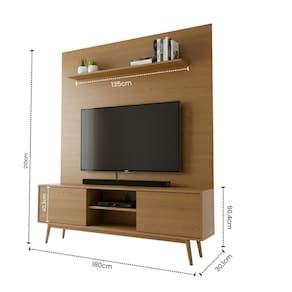 O conjunto é composto por rack com portas de correr, painel de parede, prateleira superior e base com pés palito, oferecendo organização, praticidade e um visual sofisticado. Suporta TVs de até 75 polegadas.