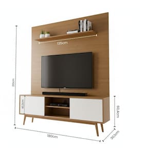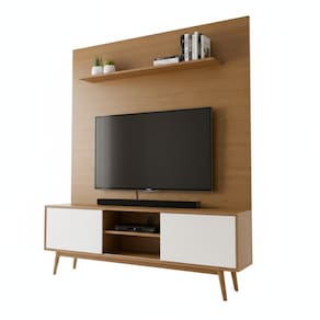 O conjunto é composto por rack com portas de correr, painel de parede, prateleira superior e base com pés palito, oferecendo organização, praticidade e um visual sofisticado. Suporta TVs de até 75 polegadas.