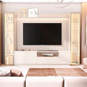 Produzido 100% em MDF, o Conjunto Vitória Régia oferece durabilidade, resistência e excelente padrão de acabamento, sendo ideal para quem valoriza beleza, conforto e praticidade em cada detalhe. Produto Montado: Sim Acabamento: Pintura UV Acabamento da Gaveta: Pintura UV Acabamento da Porta: Pintura UV Acabamento da Prateleira: Pintura UV Acabamento dos Pés: Pintura Acompanha Lâmpada: Não Acompanha Manual de Instalação: Sim Altura do Conjunto: 219 cm Altura do Painel: 157 cm Altura do Rack: 62 cm Altura dos Pés: 7 cm Altura Máxima dos Pés: 7.0000 Ambiente Principal: Sala de Estar codigo_ean: 7900288325471 Complexidade da Montagem: Alta: deve ser montado por um montador especializado Cor: Off White Cor do Produto: Off White Cor Flex: não Cor Interna: Off White Escala de Brilho: Semi-Brilho Escala de Brilho da Gaveta: Semi-Brilho Escala de Brilho da Porta: Semi-Brilho Escala de Brilho da Prateleira: Semi-Brilho Espessura do Painel: 1,5 cm Espessura do Tampo: 15 mm Espessura do Vidro: 3 mm Fixação na Parede: Sim Gaveta com Chave: Não Ideal para TVs até (Polegadas): 84 Informações Complementares: Iluminação fita LED Itens Inclusos: 1 Rack, 1 Painel, 2 Torres, Kit Ferragens e Manual de Montagem Largura do Conjunto: 305 cm Largura do Painel: 233 cm Largura do Rack: 233 cm Linha ou Coleção: Vitoria Regia Manual de Especificação Técnica: https://product-hub-prd.madeiramadeira.com.br/507425525/documents/8107e9c0-fcd8-43a7-a6d9-f952d2e33874337941154041770319413469.pdf Manual de Montagem e Instalação: https://product-hub-prd.madeiramadeira.com.br/507425525/documents/745abf72-f958-4496-98a2-e900f493d35b337940954041770319390399.pdf Marca: JB Bechara Material da Gaveta: MDF Material da Porta: MDF Material da Prateleira: MDF Material do Puxador da Porta: MDF Material dos Pés: MDF Material Principal: MDF Montagem Flex: não Necessita Montagem: Sim Origem do Produto: Nacional Peso do Painel: 62,5 kg Peso do Rack: 51 kg Peso Máximo por Gaveta: 2 kg Peso Máximo por Prateleira: 2 kg Possui Adega: Não Possui Espelho: Não Possui iluminação: Sim Possui Passa Cabos: Sim Possui Pés: Rodapé Possui Prateleiras: Sim Possui Tomada: Não Possui Vidro: Sim Profundidade do Conjunto: 36 cm Profundidade do Rack: 36 cm Quantidade de Gavetas: 02 Gavetas Quantidade de Nichos: 01 Recomendações de Uso, Manutenção e Limpeza: Na remoção da poeira utilize flanela limpa e levemente umedecida. Não exponha à luz solar e locais úmidos. Não encoste o móvel na parede para evitar transmissão de umidade. Sapatas Niveladoras: Não Sistema de Montagem: O produto será entregue desmontado, acompanhado do manual de montagem. Não oferecemos serviço de montagem. A montagem e instalação é por conta do cliente. Recomendamos a contratação de um profissional. Não nos responsabilizamos por danos decorrentes a e Suporte de TV Universal Incluso: Não Tipo de Corrediça da Gaveta: Metálica Telescópica Tipo de Dobradiça/Corrediça da Porta: Metálica Tipo de Puxador da Gaveta: Embutido Tipo de Puxador da Porta: Embutido