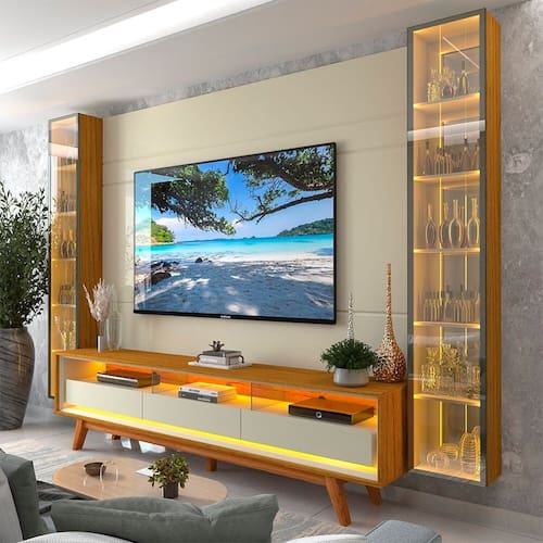 Transforme sua sala com o Conjunto Painel Luminare Rack Requinte 2 Torres Luminare. Design moderno, iluminação em LED aconchegante e portas em vidro reflecta que elevam a sofisticação. Praticidade e charme em um único móvel para valorizar sua casa. Produto Montado: Sim Acabamento: Pintura UV Acabamento da Gaveta: Pintura UV Acabamento da Porta: Vidro Acabamento da Prateleira: Pintura UV Acabamento dos Pés: Pintura Acompanha Lâmpada: Não Acompanha Manual de Instalação: Sim Altura do Conjunto: 238 cm Altura do Espelho: 106,3 cm Altura do Painel: 217 cm Altura do Rack: 58 cm Altura dos Pés: 20 cm Altura Máxima dos Pés: 20.0000 Ambiente Principal: Sala de Estar codigo_ean: 7900288232175 Complexidade da Montagem: Alta: deve ser montado por um montador especializado Cor: Off White/Naturale Cor do Produto: Off White/Naturale Cor Flex: Não Cor Interna: Off White Escala de Brilho: Brilhante Escala de Brilho da Gaveta: Semi-Fosco Escala de Brilho da Porta: Brilhante Escala de Brilho da Prateleira: Semi-Fosco Espessura do Espelho: 3 mm Espessura do Painel: 3,5 cm Espessura do Tampo: 15 mm Espessura do Vidro: 3 mm Fixação na Parede: Sim Formato do Espelho: Retangular Gaveta com Chave: Não Ideal para TVs até (Polegadas): 84 Informações Complementares: Iluminação por fita LED. Fixação dos espelhos da torre por encaixe/apoio. Itens Inclusos: 1 Rack, 1 Painel, Manual de Montagem e Kit Ferragem Largura do Conjunto: 293 cm Largura do Espelho: 35,1 cm Largura do Painel: 217 cm Largura do Rack: 211,4 cm Linha ou Coleção: Luminare/Requinte Manual de Especificação Técnica: https://product-hub-prd.madeiramadeira.com.br/555032550/documents/289e224d-8e28-47ef-b94d-5169c44f46a4316250455017562286222304.pdf Manual de Montagem e Instalação: https://product-hub-prd.madeiramadeira.com.br/555032550/documents/9119cf6a-1d2b-417c-8d0d-ebfc410138df316250355017562285874926.pdf Marca: Gelius Móveis Material da Gaveta: MDF Material da Porta: Vidro Material da Prateleira: MDF Material dos Pés: Madeira Maciça Material Principal: MDF Montagem Flex: Não Necessita Montagem: Sim Origem do Produto: Nacional Peso do Painel: 58 kg Peso do Rack: 57 kg Peso Máximo por Gaveta: 5 kg Peso Máximo por Prateleira: 5 kg Possui Adega: Não Possui Espelho: Sim Possui iluminação: Sim Possui Passa Cabos: Sim Possui Pés: 02 Possui Portas: Sim Possui Prateleiras: Sim Possui Tomada: Não Possui Vidro: Sim Profundidade do Conjunto: 38,5 cm Profundidade do Painel: 3.5000 Profundidade do Rack: 34,8 cm Quantidade de Espelho: 04 Espelhos com Tamanhos Iguais Quantidade de Gavetas: 03 Gavetas Recomendações de Uso, Manutenção e Limpeza: A limpeza do produto deve ser feita por meio do uso de um pano, umedecido com água, e um pano seco. É importante para fazer a limpeza do móvel nunca utilizar produtos químicos ou abrasivos. Para conservar o padrão de qualidade dos produtos Gelius, nunca arraste um móvel se este estiver cheio. Nunca puxe o móvel de frente para você, pois ele pode balançar e provocar acidentes. Sapatas Niveladoras: Não Sistema de Montagem: Convencional: parafusos, pregos, cavilhas, etc. Suporte de TV Universal Incluso: Não Tipo de Corrediça da Gaveta: Metálica Telescópica Tipo de Dobradiça/Corrediça da Porta: Aço Tipo de Fixação do Espelho: Molduras Tipo de Madeira Maciça dos Pés: Pinus Tipo de Puxador da Gaveta: Embutido Tipo de Puxador da Porta: Embutido