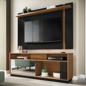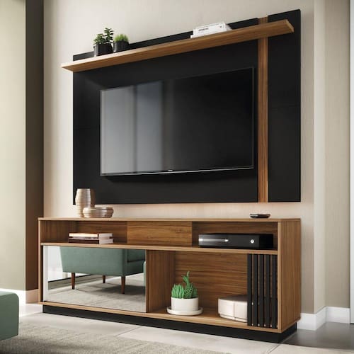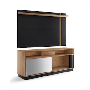 O Rack Caiobá com Painel Leme são ideais para sua sala! Com designer moderno a bancada possui uma porta de correr com puxador de alumínio e aplicação de espelho que pode ser posicionada do lado esquerdo ou do lado direito atras das ripas decorativas de madeira. Possui também nichos espaçosos ideias para acomodar os mais variados tipos de objetos de decoração, aparelhos eletrônicos entre outros. A Bancada Suporta TVs de até 65 polegadas. Já o Painel Leme suporta TVs de até 60 polegadas e dará um toque especial ao ambiente, um produto super funcional, pois é extensivo podendo ser montado com largura de 1,60m ou 1,80m. Além disso, seus detalhes são flex para você poder escolher qual mais gosta. Acabamento: Pintura UV Acabamento da Porta: Vidro Acabamento da Prateleira: Pintura UV Altura do Espelho: 37 cm Altura do Painel: 108 cm Altura do Rack: 64,3 cm Altura dos Pés: 1 cm calculo: unidade Complexidade da Montagem: Média: pode ser montado por mais de uma pessoa e/ou necessite de maior conhecimento para montagem Cr: Noce Milano/Preto Fosco Cr do Produto: Noce Milano/Preto Fosco Cr Interna: Noce Milano Escala de Brilho: Fosco Escala de Brilho da Porta: Brilhante Escala de Brilho da Prateleira: Fosco Espessura do Espelho: 3 mm Espessura do Painel: 18 cm Fita Integrada: Sim Formato do Espelho: Retangular Ideal para TVs até (Polegadas): 60 Itens Inclusos: 1 Rack Caioba, 1 Painel Leme, Kit Ferragens e Manual de Montagem Largura do Espelho: 78,6 cm Largura do Painel: 160 cm Largura do Rack: 160 cm Manual de Montagem e Instalação: https://cdn2.madeiramadeira.com.br/atributo/colibri-moveis/707559-caioba-leme.pdf Material da Porta: MDP Material da Prateleira: MDP Material dos Pés: Polipropileno Material Principal: MDP Necessita Montagem: Sim Origem do Produto: Nacional Peso do Painel: 29,5 kg Peso do Rack: 36,8 kg Peso Máximo por Prateleira: 2 kg Possui Espelho: Sim Possui Gavetas: Não Possui iluminação: Não Possui Pés: Rodapé Possui Portas: 01 Possui Prateleiras: 01 Possui Rodízio: Não Possui Tomada: Não Possui Vidro: Não Profundidade do Rack: 40,3 cm Quantidade de Espelho: 01 Quantidade de Nichos: 02 Recomendações de Uso, Manutenção e Limpeza: Pano Seco Sapatas Niveladoras: Sim Sistema de Montagem: Cavilha, Parafuso e Cola status-cadastro: Aprovado Suporta Até (kg): 97 kg Suporte de TV Universal Incluso: Não Tamanho: Tipo de Fixação do Espelho: Fita Dupla Face Tipo de Porta: Correr Tipo de Puxador da Porta: Embutido