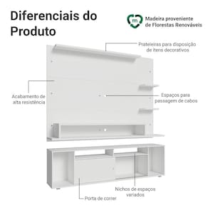 O Painel para TV comporta TVs de até 60 polegadas e conta com espaço para passagem de fios e cabos, ajudando a manter tudo organizado e com visual mais limpo. O Rack possui nichos de tamanhos variados, com espaços que facilitam a organizaçã, oferecendo melhor aproveitamento do espaço.