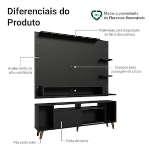 O acabamento de alta resistência em preto confere um visual moderno e sofisticado ao conjunto, enquanto os pés em amadeirado Rustic trazem mais personalidade.