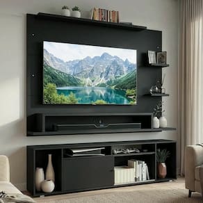 O Painel para TV comporta TVs de até 60 polegadas e conta com espaço para passagem de fios e cabos, ajudando a manter tudo organizado e com visual mais limpo. O Rack possui nichos de tamanhos variados, com espaços que facilitam a organizaçã, oferecendo melhor aproveitamento do espaço.