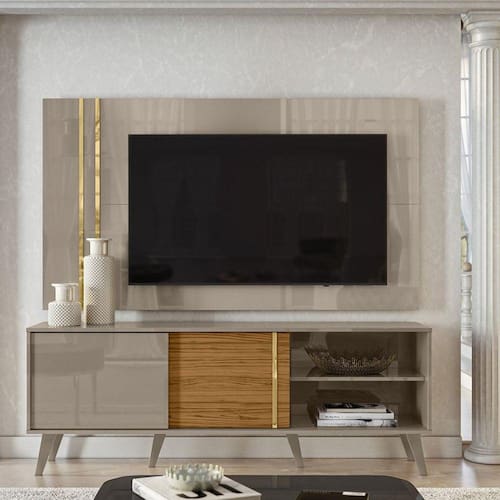 Um móvel sofisticado com uma composição de cores moderna, pintura imitando pedra, perfis com acabamento em hot stamping e pés de poliestireno. O Combo Cronos une todas essas características sem deixar de lado a funcionalidade. Com 1600mm de largura, ele possui 2 portas de correr, painel e bancada que suportam TV’s de até 65” e chapas de 15mm. Acabamento: Pintura UV Acabamento da Porta: Pintura UV Acabamento da Prateleira: Pintura UV Acabamento dos Pés: Pintura Altura do Painel: 90 cm Altura do Rack: 57,5 cm Altura dos Pés: 16 cm Ambiente Principal: Sala de Estar Complexidade da Montagem: Média: pode ser montado por mais de uma pessoa e/ou necessite de maior conhecimento para montagem Cor: Cinza/Naturale Cor do Produto: Cinza/Naturale Escala de Brilho: Semi-Brilho Escala de Brilho da Porta: Semi-Brilho Escala de Brilho da Prateleira: Semi-Brilho Espessura do Painel: 3 cm Ideal para TVs até (Polegadas): 65 Informações Complementares: Diferenciais do produto: Perfis com acabamento em hot stamping, painéis em MDP de 15mm, pés de poliestireno inclusos e portas de correr. Itens Inclusos: 1 Rack, 1 Painel, Kit Ferragens e Manual de Montagem Largura do Painel: 160 cm Largura do Rack: 159 cm Manual de Montagem e Instalação: https://cdn2.madeiramadeira.com.br/atributo/madetec/946927-713-esquema-de-montagem.pdf Material da Porta: MDP Material da Prateleira: MDP Material dos Pés: MDP Material Principal: MDP Montagem Flex: Girofix Necessita Montagem: Sim Origem do Produto: Nacional Peso do Painel: 16,7 kg Peso do Rack: 22,2 kg Peso Máximo por Prateleira: 7 kg Possui Espelho: Não Possui iluminação: Não Possui Pés: 06 Possui Portas: 02 Possui Prateleiras: 01 Possui Tomada: Não Possui Vidro: Não Profundidade do Rack: 36,5 cm Recomendações de Uso, Manutenção e Limpeza: Para a limpeza utilizar um pano limpo e seco. Não limpar com produtos abrasivos ou escovas. Não deixar exposta à luz do sol diretamente pois isso irá diminuir a vida útil do produto. Este produto não é recomendado para ambientes externos onde possa receber chuva. Sapatas Niveladoras: Não Sistema de Montagem: Girofix Suporte de TV Universal Incluso: Não Tipo de Dobradiça/Corrediça da Porta: Metálica Tipo de Puxador da Porta: Externo