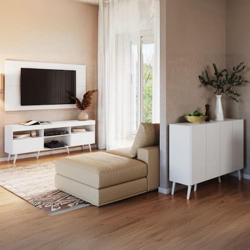 O rack dispõe de 2 portas articuladas, além de nichos perfeitos para organizar equipamentos eletrônicos e livros com charme e eficiência. Seu tampo suporta até 19kg e acomoda itens decorativos. Já o aparador surpreende com suas 4 portas de puxador passante (embutido) e prateleiras internas que suportam até 5kg cada, oferecendo amplo espaço para ordenar seus objetos e manter tudo sempre à mão. Os pés no estilo retrô em polipropileno completam o design vintage e sofisticado dos móveis.