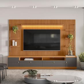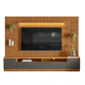 O Conjunto Ouro Preto foi projetado para TV de até 75 polegadas, contendo painel ripado e fita de Led que deixam a sua sala ainda mais moderna. Além disso, acompanha prateleiras para dispor objetos decorativos. Possui ainda gavetas e portas de abrir, facilitando o armazenamento e organização de pertences.