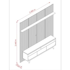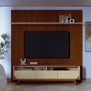 Painel em MDF frisado (baixo relevo), três gavetas com corrediças telescópicas, gavetas laterais com detalhe curvo, tampo da bancada suspenso em 25mm com borda chanfrada, pés usinados, estrutura com chapas em MDP e MDF de 12, 15 e 25mm. Produto Montado: Sim Acabamento: Pintura UV Acabamento da Gaveta: Pintura UV Acabamento da Prateleira: Pintura UV Acabamento dos Pés: Pintura Altura do Painel: 244,5 cm Altura do Rack: 62,5 cm Altura dos Pés: 7,5 cm Altura Máxima dos Pés: 7.5000 Ambiente Principal: Sala de Estar codigo_ean: 7900288101006 Complexidade da Montagem: Média: pode ser montado por mais de uma pessoa e/ou necessite de maior conhecimento para montagem Cor: Cinamomo/Off White Cor do Produto: Cinamomo/Off White Escala de Brilho: Semi-Brilho Escala de Brilho da Gaveta: Semi-Brilho Escala de Brilho da Prateleira: Semi-Brilho Espessura do Painel: 18,5 cm Espessura do Tampo: 25 mm Gaveta com Chave: Não Ideal para TVs até (Polegadas): 75 Itens Inclusos: 1 Rack, 1 Painel, 1 Manual de Montagem Largura do Painel: 238 cm Largura do Rack: 200 cm Manual de Especificação Técnica: https://product-hub-prd.madeiramadeira.com.br/982051/documents/864c2a1c-fbf3-42eb-a35b-527a807db109275495082617424811018078.pdf Manual de Montagem e Instalação: https://product-hub-prd.madeiramadeira.com.br/982051/documents/53280ce2-75d5-49f2-946d-3dd2db41a9dc275494982617424810999662.pdf Marca: Madetec Material da Gaveta: MDF/MDP Material da Prateleira: MDP Material dos Pés: MDP Material Principal: MDF/MDP Necessita Montagem: Sim Peso do Painel: 73 kg Peso do Rack: 54,4 kg Peso Máximo por Gaveta: 5 kg Peso Máximo por Prateleira: 5 kg Possui Espelho: Não Possui iluminação: Não Possui Passa Cabos: Sim Possui Pés: 05 Possui Portas: Não Possui Tomada: Não Possui Vidro: Não Profundidade do Painel: 18.5000 Profundidade do Rack: 36 cm Quantidade de Gavetas: 03 Gavetas Quantidade de Nichos: Não Recomendações de Uso, Manutenção e Limpeza: "Para a limpeza utilizar um pano limpo e seco. Não limpar com produtos abrasivos ou escovas;Não deixar exposta à luz do sol diretamente pois isso irá diminuir a vida útil do produto;Este produto Não é recomendado Para ambientes externos onde possa receber chuva." Sapatas Niveladoras: Não Sistema de Montagem: Girofix Suporte de TV Universal Incluso: Não Tipo de Corrediça da Gaveta: Metálica Telescópica Tipo de Puxador da Gaveta: Embutido