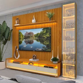 O Conjunto Painel Nobre Clean Rack Requinte Torre Luminare com rodízios une sofisticação e funcionalidade. Com acabamento ripado em MDF autêntico, LED em cor quente, rack com gavetas telescópicas e torre com portas em vidro reflecta, o conjunto garante estilo, praticidade e requinte para sua sala. Produto Montado: Sim Acabamento: Pintura UV Acabamento da Gaveta: Pintura UV Acabamento da Porta: Vidro Acabamento da Prateleira: Pintura UV Acompanha Lâmpada: Não Acompanha Manual de Instalação: Sim Altura do Conjunto: 224 cm Altura do Espelho: 106,3 cm Altura do Painel: 217 cm Altura do Rack: 45 cm Altura dos Pés: cm Ambiente Principal: Sala de Estar codigo_ean: 7900288223685 Complexidade da Montagem: Alta: deve ser montado por um montador especializado Cor: Naturale/Off White Cor do Produto: Naturale/Off White Cor Flex: Não Cor Interna: Off White Escala de Brilho: Semi-Fosco Escala de Brilho da Gaveta: Semi-Fosco Escala de Brilho da Porta: Brilhante Escala de Brilho da Prateleira: Semi-Fosco Espessura do Espelho: 3 mm Espessura do Painel: 24,6 cm Espessura do Tampo: 15 mm Espessura do Vidro: 3 mm Fixação na Parede: Sim Formato do Espelho: Retangular Gaveta com Chave: Não Ideal para TVs até (Polegadas): 84 Informações Complementares: Iluminação por fita LED. Fixação dos espelhos da torre por encaixe/apoio. Itens Inclusos: 1 Rack, 1 Painel, Manual de Montagem e Kit Ferragem Largura do Conjunto: 266,8 cm Largura do Espelho: 35,1 cm Largura do Painel: 228,8 cm Largura do Rack: 211,4 cm Linha ou Coleção: Nobre Clean/Requinte/Luminare Manual de Especificação Técnica: https://product-hub-prd.madeiramadeira.com.br/989644953/documents/017b3ead-ee6e-43c2-8fa7-f24d7187c0b6318373555017569937109706.pdf Manual de Montagem e Instalação: https://product-hub-prd.madeiramadeira.com.br/989644953/documents/e3e72bd3-be72-4a9c-9554-417e50d91f22318373455017569936799312.pdf Marca: Gelius Móveis Material da Gaveta: MDF Material da Porta: Vidro Material da Prateleira: MDF Material Principal: MDF Montagem Flex: Não Necessita Montagem: Sim Origem do Produto: Nacional Peso do Painel: 86 kg Peso do Rack: 50 kg Peso Máximo por Gaveta: 5 kg Peso Máximo por Prateleira: 5 kg Possui Adega: Não Possui Espelho: Sim Possui iluminação: Sim Possui Passa Cabos: Sim Possui Pés: Não Possui Portas: Sim Possui Prateleiras: Sim Possui Tomada: Não Possui Vidro: Sim Profundidade do Conjunto: 40 cm Profundidade do Painel: 24.6000 Profundidade do Rack: 34,8 cm Quantidade de Espelho: 02 Espelhos com Tamanhos Iguais Quantidade de Gavetas: 03 Gavetas Quantidade de Nichos: 09 Recomendações de Uso, Manutenção e Limpeza: A limpeza do produto deve ser feita por meio do uso de um pano, umedecido com água, e um pano seco. É importante para fazer a limpeza do móvel nunca utilizar produtos químicos ou abrasivos. Para conservar o padrão de qualidade dos produtos Gelius, nunca arraste um móvel se este estiver cheio. Nunca puxe o móvel de frente para você, pois ele pode balançar e provocar acidentes. Sistema de Montagem: Convencional: parafusos, pregos, cavilhas, etc. Suporte de TV Universal Incluso: Não Tipo de Corrediça da Gaveta: Metálica Telescópica Tipo de Dobradiça/Corrediça da Porta: Aço Tipo de Fixação do Espelho: Molduras Tipo de Puxador da Gaveta: Embutido Tipo de Puxador da Porta: Embutido