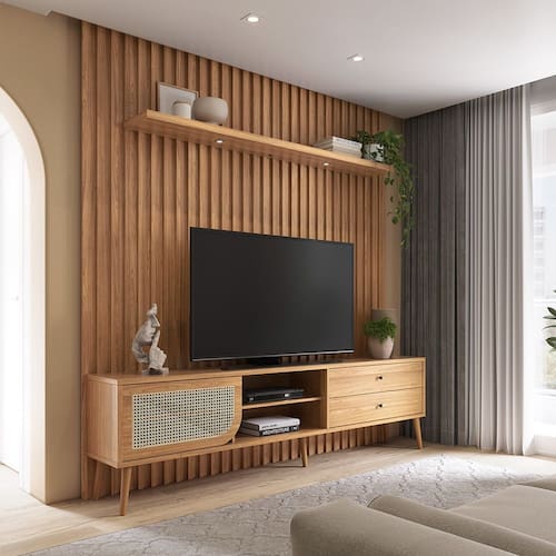 Rack com Painel Ripado TB323L para TV Até 75 Polegadas 02 Gavetas 01 Porta com Led Freijó Dalla Costa - Rack com Painel Ripado para TV Até 75 Polegadas