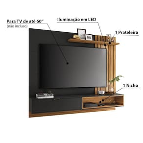 Características - Preto/Castanho - Estrutura: MDP - Acabamento: Pintura UV - Detalhe em madeira maciça ripada - Passa fio - 1 Porta basculante - 1 Prateleira - 1 Luminária em Led - 1 Nicho - Para TV até 60" (não incluso) - Peso suportado: 50 kg - Móvel entregue desmontado. Montagem não inclusa - Marca: Colibri