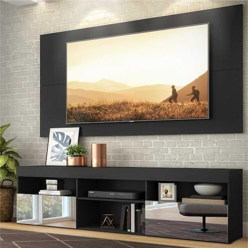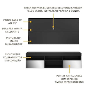 Produzido em MDP com pintura UV, que garante maior durabilidade e facilidade na limpeza, possui espaço para os equipamentos eletrônicos e nichos para objetos decorativos, além de duas portas articuladas com espelho e um amplo espaço interno para manter seus pertences organizados. Opainel para TV de até 65possui espaçamento para passagem dos fios, que permite deixar os cabos mais organizados. Devido as variações de tamanho dos televisores no mercado, sugerimos que verifique as medidas da sua TV e compare com o painel antes de efetuar a compra.Os espelhos são de vidro (o que evita que a imagem fique distorcida) e lapidados, ou seja, passam por um processo para que as bordas não fiquem cortantes, o que garante maior segurança.