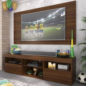 Produzido em MDP com pintura UV, que garante maior durabilidade e facilidade na limpeza, possui espaço para os equipamentos eletrônicos e nichos para objetos decorativos, além de duas portas articuladas com um amplo espaço interno para manter seus pertences organizados. O painel para TV até 65 possui espaçamento para passagem dos fios, que permite deixar os cabos mais organizados. Devido as variações de tamanho dos televisores no mercado, sugerimos que verifique as medidas da sua TV e compare com o painel antes de efetuar a compra.