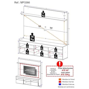 Dimensões do produto montado: Altura: 164cm | Largura: 175cm | Profundidade: 35cm *Devido as variações de tamanho dos televisores no mercado, sugerimos que verifique as medidas da sua TV e compare com o painel antes de efetuar a compra. *Você pode consultar as medidas internas na imagem técnica do produto.