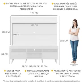 Dimensões do produto montado: Altura: 180cm | Largura: 175cm | Profundidade: 35cm *Devido as variações de tamanho dos televisores no mercado, sugerimos que verifique as medidas da sua TV e compare com o painel antes de efetuar a compra. *Você pode consultar as medidas internas na imagem técnica do produto.