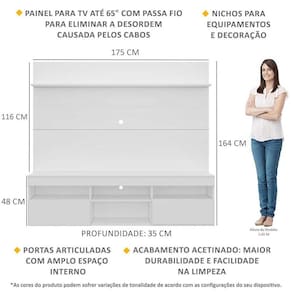 Dimensões do produto montado: Altura: 164cm | Largura: 175cm | Profundidade: 35cm *Devido as variações de tamanho dos televisores no mercado, sugerimos que verifique as medidas da sua TV e compare com o painel antes de efetuar a compra. *Você pode consultar as medidas internas na imagem técnica do produto.