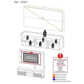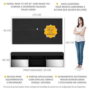 Dimensões do produto montado: Painel - Altura: 90cm | Largura: 175cm | Profundidade: 2,5cm Rack - Altura: 48cm | Largura: 175cm | Profundidade: 35cm *Devido as variações de tamanho dos televisores no mercado, sugerimos que verifique as medidas da sua TV e compare com o painel antes de efetuar a compra. *Você pode consultar as medidas internas na imagem técnica do produto.
