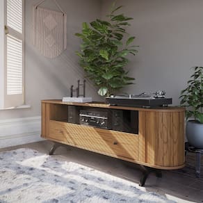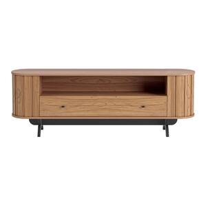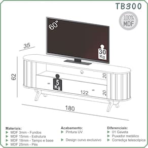 Características: Estrutura 100% MDF Acabamento em Pintura UV Design Curvo Exclusivo 01 Gaveta com Corrediças Telescópicas Pés em MDF Laterais com Ripado Curvo Puxadores Metálicos Ideal para TV até 60 Polegadas
