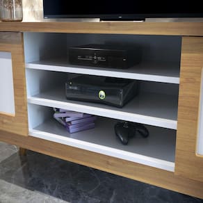 Características técnicas: -Espaço no tampo para TV com pé 160x38 cm -LXA- -Material: MDP/MDF -Acabamento em pintura UV -Estilo da pintura principal: Texturizado -Escala da pintura principal/secundária: Fosco -Estilo da pintura secundaria: Acetinado -3 Nichos -2 Portas de bater -Tipo de dobradiça da porta: Metálica de pressão -Passa Cabos