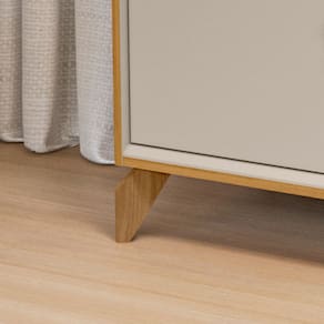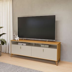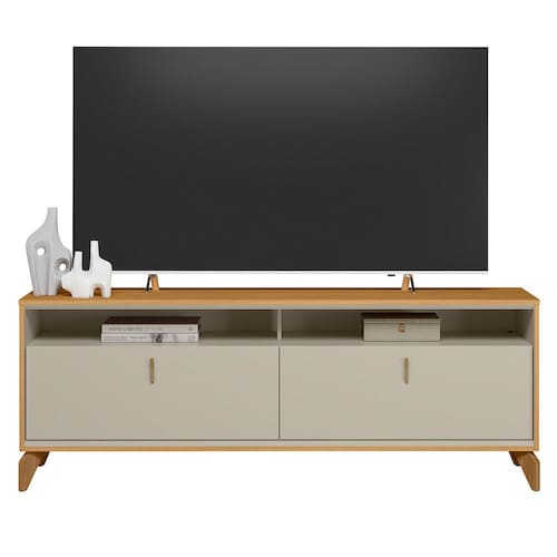 Nicho: 2 Passa Fios: 2 Porta: 2 portas basculantes em MDP com espessura de 15mm Tampo: 15mm material em MDP Pés: 4 pés de madeira em 12cm de altura Dobradiças: 4 dobradiça metálica