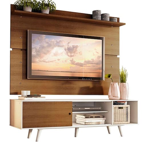 O painel comporta de até 65 polegadas e contempla uma prateleira na parte superior, perfeita para objetos decorativos. Por ser separado do rack, pode ser fixado na altura desejada.