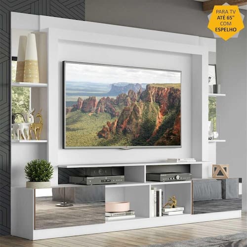 O Rack Estante com Painel TV 65" e Espelho Oslo Multimóveis é perfeito para você deixar seu ambiente organizado e muito bem decorado. Produzido em MDP, que garante maior durabilidade e facilidade na limpeza, além de um acabamento superior, possui 2 portas articuladas com um excelente espaço interno para organizar seus pertences, prateleiras para que você possa personalizar a decoração e nichos para acomodar todos os equipamentos. Os detalhes com espelhos nas portas e prateleiras deixam o móvel mais requintado, criando um ambiente moderno e charmoso. Os espelhos são de vidro (o que evita que a imagem fique distorcida) e lapidados, ou seja, passam por um processo para que as bordas não fiquem cortantes, o que garante maior segurança. O painel para TV de até 65 (suporta até 30kg) possui espaçamento para passagem dos fios, que permite deixar os cabos mais organizados. Uma sala de estar moderna, aconchegante e linda para receber os amigos e curtir os melhores filmes e séries.