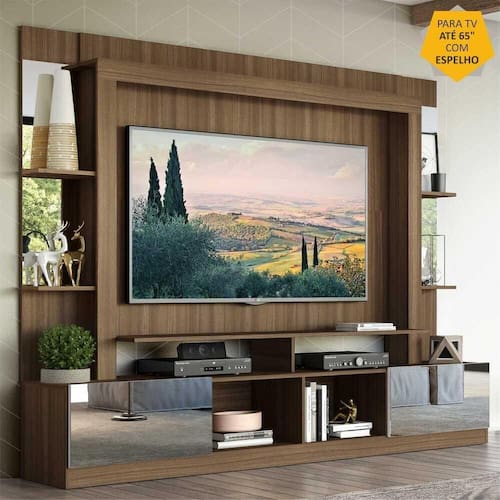 O Rack Estante com Painel TV 65" e Espelho Oslo Multimóveis é perfeito para você deixar seu ambiente organizado e muito bem decorado. Produzido em MDP, que garante maior durabilidade e facilidade na limpeza, além de um acabamento superior, possui 2 portas articuladas com um excelente espaço interno para organizar seus pertences, prateleiras para que você possa personalizar a decoração e nichos para acomodar todos os equipamentos. Os detalhes com espelhos nas portas e prateleiras deixam o móvel mais requintado, criando um ambiente moderno e charmoso. Os espelhos são de vidro (o que evita que a imagem fique distorcida) e lapidados, ou seja, passam por um processo para que as bordas não fiquem cortantes, o que garante maior segurança. O painel para TV de até 65 (suporta até 30kg) possui espaçamento para passagem dos fios, que permite deixar os cabos mais organizados. Uma sala de estar moderna, aconchegante e linda para receber os amigos e curtir os melhores filmes e séries.