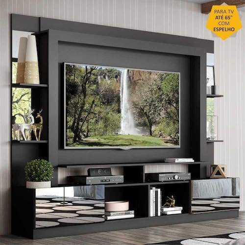 O Rack Estante com Painel TV 65" e Espelho Oslo Multimóveis é perfeito para você deixar seu ambiente organizado e muito bem decorado. Produzido em MDP, que garante maior durabilidade e facilidade na limpeza, além de um acabamento superior, possui 2 portas articuladas com um excelente espaço interno para organizar seus pertences, prateleiras para que você possa personalizar a decoração e nichos para acomodar todos os equipamentos. Os detalhes com espelhos nas portas e prateleiras deixam o móvel mais requintado, criando um ambiente moderno e charmoso. Os espelhos são de vidro (o que evita que a imagem fique distorcida) e lapidados, ou seja, passam por um processo para que as bordas não fiquem cortantes, o que garante maior segurança. O painel para TV de até 65 (suporta até 30kg) possui espaçamento para passagem dos fios, que permite deixar os cabos mais organizados. Uma sala de estar moderna, aconchegante e linda para receber os amigos e curtir os melhores filmes e séries.